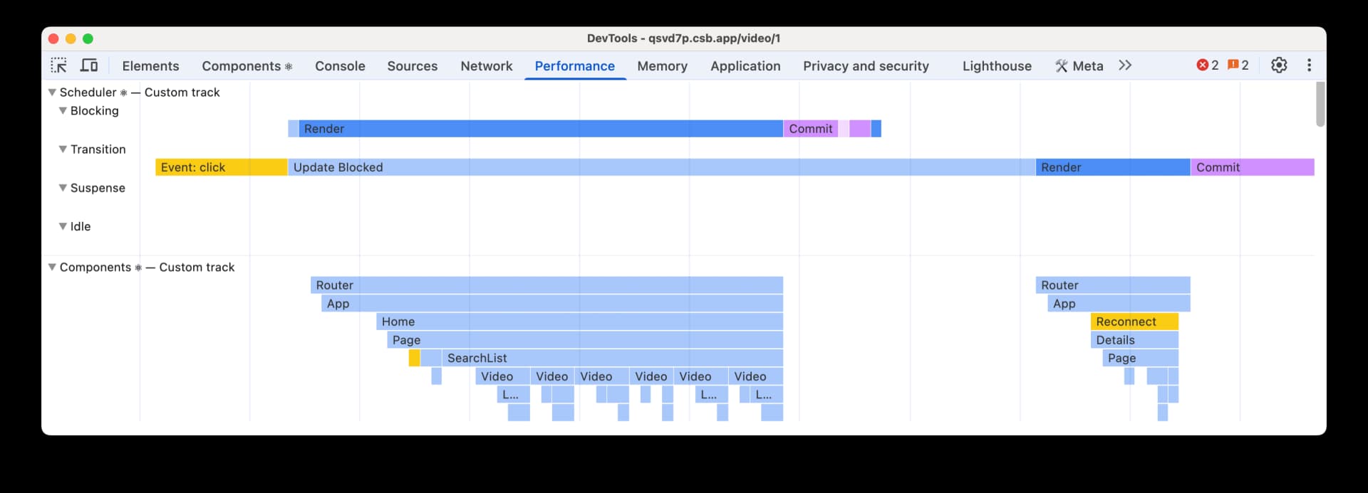 We’re working on a new set of custom tracks to performance profilers using browser APIs that allow adding custom tracks to provide more information about the performance of your React app.